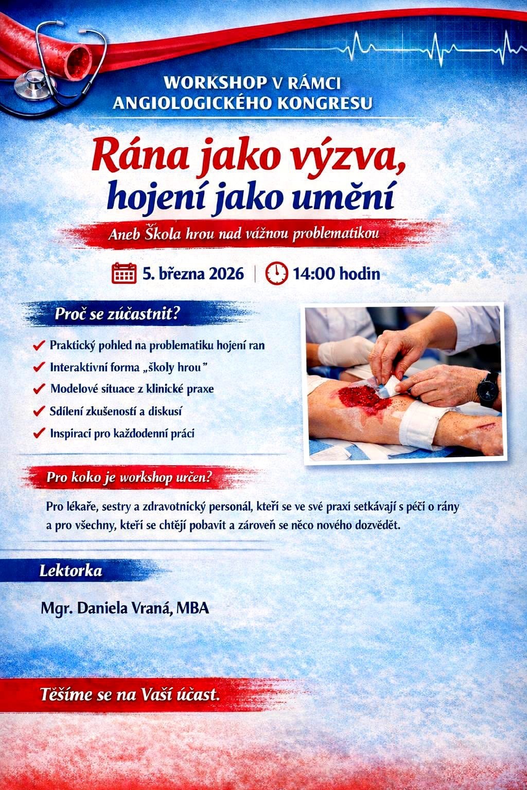Workshop je určen pro sestry i lékaře, kteří se ve své praxi setkávají s péčí o rány, a pro všechny, kteří se chtějí pobavit a něco nového se dozvědět.